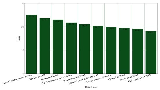 There are 214 hotels that are common in the dataset of both of the hotel booking websites. Top-10 recommendation generation based on average numerical ratings of Booking is shown in Figure 7. Considering the two datasets of the common hotels, the top-10 hotels recommended by our system are shown in Figure 8 and Figure 9, respectively. From Figure 7, we can see that “Haymarket Hotel” is ranked as 2nd by average numerical ratings of Booking. It is ranked as 3rd by considering the dataset of TripAdvisor and it is ranked as 5th by considering the dataset of Booking. From Figure 8 and Figure 9, we can also see that “Hilton London Tower Bridge”, “London Marriott Hotel County Hall”, and ”Cavendish Hotel” are also included in the top-10 recommended hotels by considering the dataset of both hotel booking websites.