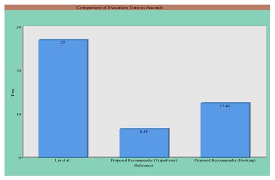 We have compared the execution time of our proposed method with that of Liu et al. [21]. The execution time of our proposed method for the 214 common hotels by considering the data of both hotel booking websites is shown in Table 15. The runtime comparison of our proposed method with [21] is shown in Figure 10. The total execution time found in the method of [21] was about 27 s, whereas that of our method was about 6.55 s and 12.46 s for the considered two datasets, respectively. The reason for this difference is that they proposed a method for opinion-feature extraction from online reviews. They randomly selected 4000 reviews and manually extracted features and opinions from these reviews. The execution time of our method is less than that reported in [21]. The reason is that our system generates scores by considering the impacts of different important keywords present in the review and uses the RSG algorithm. As opinions may vary a lot in the reviews from different domains, the extraction is challenging and time-consuming. Experimental results show the effectiveness of the proposed recommendation method.