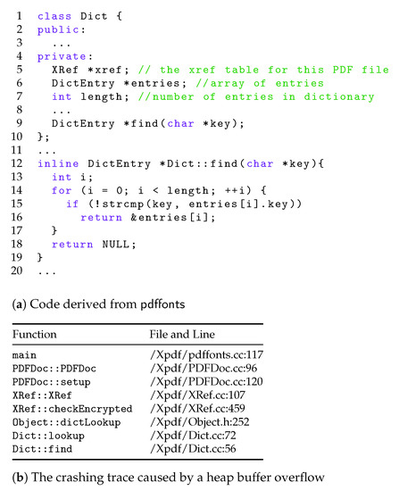 Figure 1a shows a code snippet derived from the pdffonts program, which analyzes and lists the fonts used in a Portable Document Format (PDF) file. Class Dict defined at line 1–10 stores an array of entries. Developers can call the find function defined at line 12 to retrieve the corresponding entry by a key. In the experiments, we test this program by running both AFL and ReFuzz with the AddressSanitizer [16] to detect memory errors. Figure 1b shows the crashing trace caused by a heap buffer overflow error found only by ReFuzz. The crash is caused by accessing the entries array during the iteration at line 14–17 in Figure 1a. The root cause of this error is inappropriate destruction of the dictionary in the XRef and Object classes when pdffonts attempts to reconstruct the cross-reference table (xref for short, which internally uses a dictionary) for locating objects in the PDF file, e.g., bookmarks and annotations. The crash is triggered when the xref table of the test input is mostly valid (including the most important entries, such as “Root”, “size”, “Info”, and “ID”) but cannot pass the extra check to investigate whether the PDF file is encrypted. When the program issues a search of key “Encrypt”, the dictionary has already been destructed by a previous query that checks for the validness of the xref table. A correct implementation should make a copy of the dictionary after the initial check.
