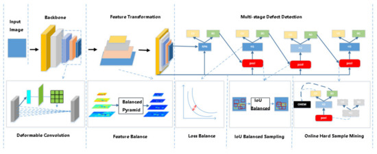The main reason is that defect detection tasks also require balanced features to achieve higher accuracy. The imbalance problem [11] and the shape features are major factors limiting the accuracy of Cascade R-CNN. Specifically, the defect detection task needs to extract the shape features of the defect and requires feature balance, object balance, and loss balance. Deformable convolution [12] calculates the offsets on the standard convolution to extract the shape features of defects, which can improve the detection accuracy. However, it also increases the complexity and computational costs of the model. Moreover, too many deformable convolutions are not conducive to network learning and will lead to a decrease in accuracy. So, the deformable convolution module needs to be carefully integrated into the backbone network. Cascade R-CNN uses feature pyramid networks (FPN) [13] to integrate the features from the backbone network. This also implies that the effects of high-level and low-level features in the first and last layers are different. To solve this problem, Libra R-CNN [14] uses the same deep integration to balance semantic features and enhance multi-level features.