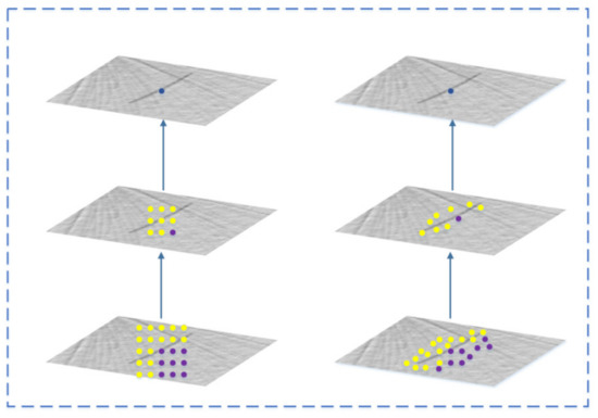 Regular convolution (left) and deformable convolution (right) for defect images. Unlike regular convolution, which uses a fixed-shape convolution kernel, deformable convolution calculates offsets and the orientation for sampling points, which makes the shape of the convolution kernel variable, thereby improving the ability to extract shape features.