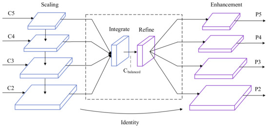 The high-level features extracted by the backbone network have more semantic meaning, while the low-level features have more descriptive content. Both level features have a huge impact on defect detection. Therefore, the method of integrating the high-level and low-level characteristics of defects in MSB R-CNN is particularly important. The feature integration through horizontal connections in FPN [13] and PANet [37] promotes the development of defect detection. However, the integrated feature maps are not balanced from each resolution. Different from using horizontal connections to integrate multi-level features, the key to feature balance is to use the same deep integration of each resolution to balance semantic features to enhance multi-level features [14]. It consists of four steps: scaling, integration, refinement and enhancement, as shown in Figure 3. The feature with a -level resolution is denoted as . In Figure 3, has the largest resolution. In order to integrate multi-level features and retain their semantic hierarchical structure, we first reshape the multi-level features to an intermediate size, i.e., the same size as , with interpolation and maximum pooling. Once the features are rescaled, the balanced semantic features are obtained by the following average formula: