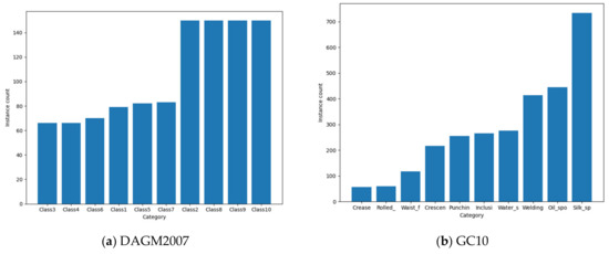 Figure 4. The class distribution of samples in the training set of (a) DAGM2007 and (b) GC10. - The GC10 data set contains 10 categories of different types of steel surface defects, for steel defect detection. It consists of 2000 images in the training set and 500 images in the test set. Each image has multiple labeled defects. The class distribution of samples in the GC10 training set is shown in Figure 4b.
