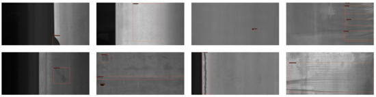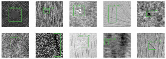 In order to verify the performance of the model in data sets of varying complexity, we also evaluate our model and other state-of-the-art models on the GC10 data set, which has much greater complexity than DAGM2007. Since the number of samples with a small area is few in GC10 data set, we ignore the APS. As shown in Table 3, our model MSB R-CNN obtains the highest mAP of 34.0%, compared to Faster R-CNN, Grid R-CNN, RetinaNet, Cascade R-CNN, SSD and Libra R-CNN. Compared with Cascade R-CNN, the mAP of MSB R-CNN is 0.6% higher. MSB R-CNN achieves the best accuracy both in AP50 and AP75. However, there is no advantage for MSB R-CNN on APM. Table 4 shows the comparison of accuracy in each category. MSB R-CNN achieves the best results in the second, fourth, fifth, sixth, eighth, and tenth categories. The visualization of the MSB R-CNN prediction results is shown in Figure 6.
