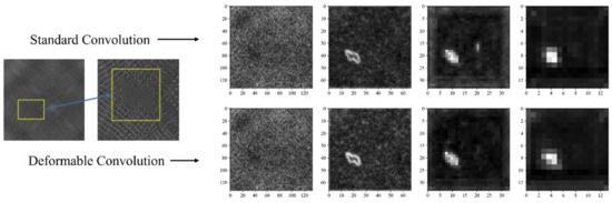 It can be seen from Table 6 that adding deformable convolution in the first and third stages can obtain the highest mAP of 66.6%; the number of parameters is also increased by 0.33 M, compared to the benchmark. The more deformable convolutions are added, the larger the number of the parameters. The feature map comparison between deformable convolution and standard convolution is given in Figure 7.