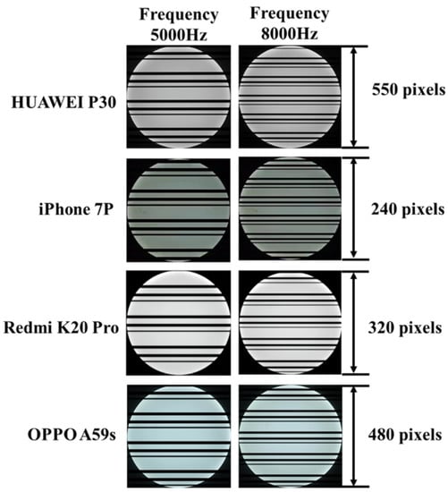 Usually, CMOS image sensors have diverse specifications [28] such as the camera frame rate, read-out duration, exposure duration, and resolution. Due to the difference of read-out duration and exposure duration, different CMOS cameras might capture different strip widths for a certain transmitting frequency according to the rolling shutter mechanism. Moreover, since CMOS cameras have different resolutions, the pixel width of stripes may be unequal for different cameras even though the bit contained is the same. Furthermore, the value of frame rate is fluctuating and would not be a constant. All these specifications lead to different camera rolling rates for CMOS image sensors. Meanwhile, Figure 3 also shows that the different camera light sensitivity (ISO) may also lead to variation in illumination.