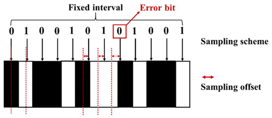 For conventional decoding schemes, the optimal decoding data result can be obtained by setting the sampling interval equal to the pixel length of one data logic and determining a best start point. However, it is worth noticing that the camera rolling rate may not be an integral multiple of the optical clock rate , then the bit duration may not be an integer, resulting in sampling offset during the decoding process. What is worse, the impact of the SFO issue will be greater with the increase in the number of transmitted data bits and finally cause error bits for UID data, as shown in Figure 4.