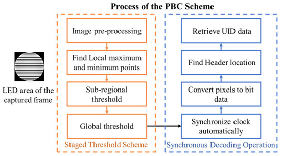 The LED area extracted in the frame is firstly converted into grayscale format, in which 255 represents completely bright level while 0 represents completely dark level. After that, the proposed PBC scheme is utilized to decode the right UID data, which includes the Staged Threshold Scheme and Synchronous Decoding Operation, as shown in Figure 5. Later, the principle of the proposed PBC scheme will be described and analyzed in detail.