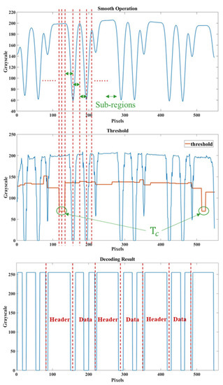 where the and are the minimum and maximum grayscale value in the sub-regions. After implementing the sub-regional threshold step, Global threshold procedure with the threshold of is further required to deal with the unchanged sub-regions. Figure 6 shows the experimental grayscale value pattern, the threshold obtained by the Staged Threshold Scheme (orange curve), and the final decoding results.