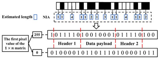 where is the average of and , and is the number of the longest consequent binary digits in the transmitted Header. Next, all the integers in IA are divided by , and the decimal part of the result is further analyzed to get a new integer array (NIA). Afterwards, identify the first pixel value of the matrix. If the value is 255, the integers at odd digits in NIA are recorded as while the integers at even digits are recorded as ( is value of the corresponding integer). Otherwise, if the value is 0, the integers at odd digits in NIA are recorded as while the integers at even digits are recorded as . At last, the UID data payload can be decoded by matching the converted binary array with the designed Header, e.g., ‘011110’, as shown in Figure 7.