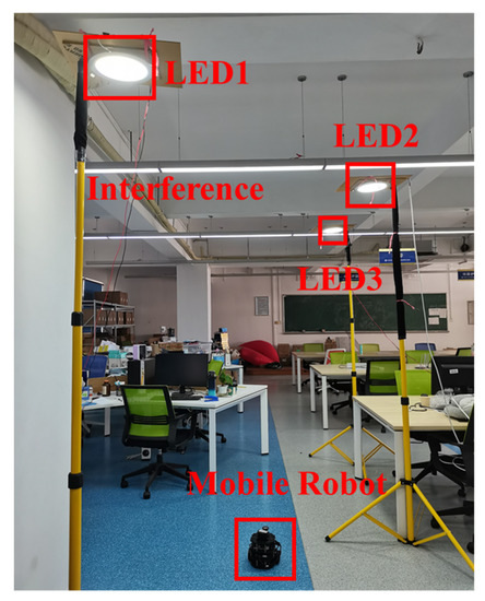 With the ever-growing demand for various indoor location-based services (LBS) [1], indoor positioning systems have attracted intensive investigations in recent years. However, Global Positioning System (GPS) cannot provide accurate indoor location information since the signals would be blocked by buildings. Due to the booming development of green lighting technology, visible light positioning (VLP) has attracted researcher’s attention for its great potential in the field of indoor positioning [2,3,4]. Since the mounting locations of indoor LEDs are usually fixed, the LED lights can be used as artificial visual landmarks. Therefore, VLP systems can utilize the visible light beams as the medium to transmit related LED location information for further position calculation. Compared to other indoor positioning proposals, such as radio frequency identification (RFID) [5], wireless local area network (WIFI) positioning technology [6], and Bluetooth positioning technology [7], VLP can provide many advantages, such as immunity to electromagnetic interference and low power consumption, and can simultaneously achieve lighting and positioning. The hardware cost is also reduced greatly since VLP utilizes the common LED lights in modern buildings to provide accurate positioning without resorting to any other specialized infrastructure. Moreover, most mobile phones on the market are equipped with a Complementary Metal-Oxide-Semiconductor (CMOS) image sensor, which can be used as VLP receivers. Therefore, the image sensor (IS)-based VLP has a great advantage in realizing indoor positioning.