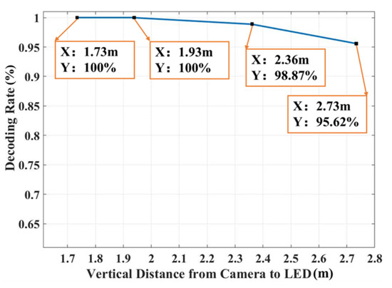 We test the robustness of the proposed PBC decoding scheme by applying four different vertical distance from industrial CMOS camera to LED lamps, which varies from 1.73 m to 2.73 m. It should be noted that although we use the distance value on the centimeter level, the distance change of one centimeter actually has little impact on the decoding performance. These transmission distance values are selected because the maximum support height in this experiment is 2.73 m. Finally, 1200 image frames are collected for each case, and the decoding rate is computed by comparing the decoding result with the corresponding UIDs. The measured decoding rates versus vertical distance from the industrial CMOS camera to LED lamp are shown in Figure 10. The decoding rate remains 100% when the height is 1.73 m and 1.93 m, but it slightly falls when the height increased to 2.36 m and further drops at the height of 2.73 m. The reason is probably that no complete data information is contained in the extracted LED area when the transmission distance is too long. In [8], similar experiments were done to test the decoding rate at different heights. However, the decoding rate would fall to about 20% when the vertical distance is 2.0 m. Moreover, in [31], the decoding rate in their experiment would drop to below 40% when the height is 2.5 m and can hardly decode correct data information when the height increases more. In conclusion, only the proposed PBC decoding scheme can have excellent decoding performance at different heights, which maintains a high decoding rate of 95.62% even when the distance is 2.73 m. It also shows that the proposed PBC scheme has a great advantage in long-distance transmission compared with other decoding schemes.