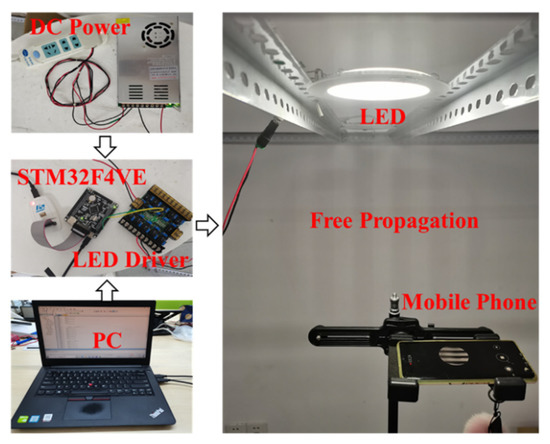 As shown in Figure 11, an experiment is set up to test the performance of the proposed PBC scheme and other conventional decoding schemes. At the transmitter, a personal computer (PC) is used to generate the encoded data, which consists of the 10-bit header (0111111110) and an 8-bit UID payload for position calculation. Then a STM32F4VE receives the data from the PC and sends it to the LED Driver through the I/O port. Afterwards, the LED Driver controls the on-off state of a single white-light LED (pattern: Kecent, KC-CBF09, power: 9 W) to transmit specific data over the air repeatedly, and though the LED driver circuit is different from that in Section 3, it would not affect the performance of our proposed PBC scheme. As for the CMOS image sensor receiver, four types of mobile phones are used to capture the continuous state changes (on/off) of the light emitted from the LED, which includes HUAWEI P30 (P30), iPhone7P (7P), Redmi K20 Pro (K20) and OPPO A59s (A59), with the resolution of 1920 × 1080, 1214 × 1262, 1280 × 720, 1920 × 1088, respectively. The camera exposure time is minimized with the aim of observing clear strip patterns from the modulated LED lamp. In addition, the vertical distance from the front camera of mobile phone to LED is 30 cm and the diameter of the LED is 10 cm.