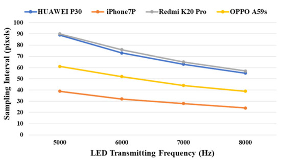 To decode the right UID data successfully, conventional decoding schemes need to adjust the interpolation and sampling operation to get an optimal sampling interval for decoding. However, different types of mobile phones usually have different camera rolling rates, resulting in very different strip widths. Hence, the best sampling intervals would be different for different receiver devices, as shown in Figure 12. Moreover, the sampling interval is not a constant but varies with the transmitting frequency, which means the conventional decoding scheme cannot deal with LED lamps that are equipped with different transmitting frequencies as well.