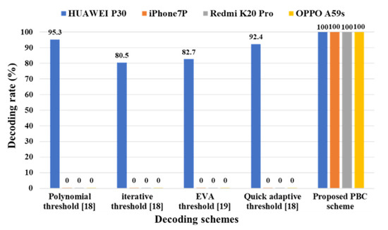 We test the decoding rate of different decoding schemes when the LED transmitting frequency is 5000 Hz and various receivers are applied. For conventional decoding schemes in [18,19], we apply the same interpolation in Figure 12 and set the best sampling interval for mobile phone HUAWEI P30, which is chosen as a criterion of the CMOS image sensor receiver in this experiment. Figure 13 shows that the decoding rate of conventional decoding algorithms are down to 0 when different mobile phones rather than HUAWEI P30 are set as receiver. It is because the parameters set in conventional decoding schemes are only suitable when the mobile phone receiver is HUAWEI P30. Nevertheless, the decoding rate can be increased by setting the corresponding sampling interval according to the receiver. On the contrary, the proposed innovative PBC decoding scheme, which has no interpolation and sampling operation, maintains excellent performance with all mobile phone receivers. It can be concluded from the experiment that only the proposed PBC scheme can decode the right UID data under different transmitter and receiver conditions. Meanwhile, the decoding rate of the proposed PBC scheme when setting HUAWEI P30 as mobile phone receiver is also better than that of conventional decoding schemes. Therefore, the proposed PBC scheme is much superior to conventional schemes when applied in actual application scenarios.