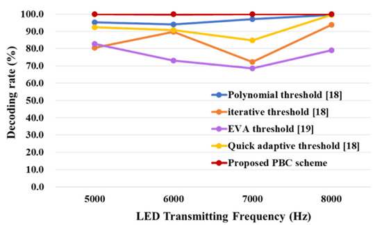 The decoding rates of various LED transmitting frequencies are also compared when the mobile phone receiver is the same (HUAWEI P30), as shown in Figure 14. For conventional decoding algorithms, the Polynomial threshold in [18] has better decoding results. The performance of iterative threshold [18] and Quick adaptive threshold scheme [18] as well as the EVA threshold scheme [19] are not satisfactory even though we have tried our best to figure out the optimal parameter value in these algorithms. However, the proposed PBC scheme can maintain excellent performance at four different transmitting frequencies without adjusting any parameters.
