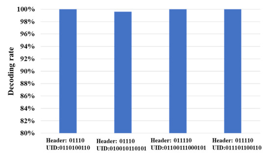 In this part, we aim to prove the feasibility of different header sequence and UID data combinations for the proposed PBC scheme. We tested four combinations in total. Header (01110) is tested with the UID data length of 10 bits and 12 bits. Meanwhile, Header (011110) is tested with UID data length of 12 bits and 14 bits. Experimental results show that the decoding rate would not be affected by the length of header or data, and all combinations reach an average decoding rate of 99.9%, as shown in Figure 16.