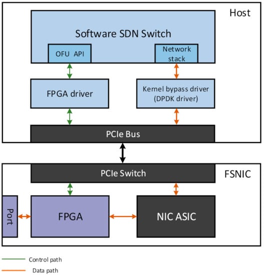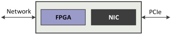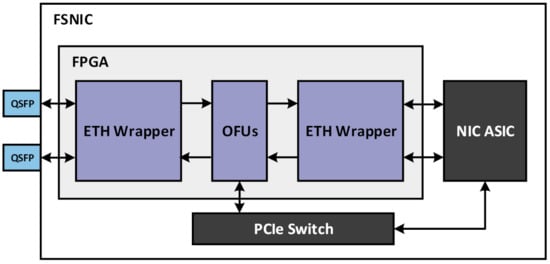 The software data plane uses NIC ASIC to receive and transmit packets. Most of the current NIC products support the features including VXLAN offloading, Single Root I/O Virtualization (SR-IOV), kernel bypassing, and so on. The software data plane utilized these features to accelerate its processing in a limited scope. The features are fixed and logic is hardened in ASIC-based NIC, so the NIC cannot support more diversified acceleration requirements for software data plane. After all, the architecture of the SDN data plane keeps evolving. In order to improve the flexibility of NIC, many NIC vendors have embedded multiple CPU cores into an NIC ASIC or programmable fabrics to trade off performance for a better programmability [,,,]. However, since general-purpose processors are involved in packet processing, the throughput can be degraded by up to 8x and latency can increase by as much as 80× when performing memory-intensive operations []. Therefore, if the network is scaled up to a 100 GbE level, the Multicore-based SmartNIC (MSNIC) may hardly reach the deployment requirements. Above all, it can draw that the hardware accelerator for software data plane must be based on the two basic conditions: good scalability to high-throughput and certain flexibility. The FPGA can meet the two requirements. An FPGA contains a great many logic, arithmetic, and memory elements, which users can configure to implement custom circuits. Thus far, many works have designed an FPGA as an accelerator, used in various fields []. However, an FPGA first needs to function as an NIC to be an accelerator for a software data plane. Although the FPGA proved to be a basic NIC performing basic packet transmitting and receiving functions [,], many other features, such as supporting for SR-IOV and DPDK, that are commonly implemented for NICs are challenging to implement on FPGAs []. Therefore, the FSNIC [,] is the best hardware to implement the accelerator for a software data plane. FSNIC integrates commodity NIC ASIC and FPGA on the same board, fully taking advantage of the existing NIC implementation rather than re-implementing these features on an FPGA. The FSNIC has an architecture as shown in Figure 1, where an FPGA is placed between the network port and the NIC, forming a bump-in-the-wire architecture. In summary, with the flexibility and performance brought by the FPGA and the tractability from the NIC ASIC, an FSNIC is surely the most suitable hardware to implement our reconfigurable accelerator.