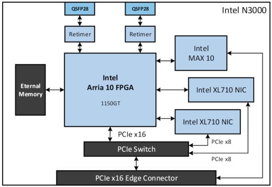 - Intel FPGA Programmable Acceleration Card N3000. Available online: https://www.intel.com/content/dam/www/programmable/us/en/pdfs/literature/po/intel-fpga-programmable-acceleration-card-n3000-for-networking.pdf (accessed on 13 July 2021).
