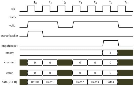 In order to ensure the efficiency and operability of data transfer between the various components in the FPGA, an Avalon interface is used for data transferring in the FPGA. The Avalon Streaming Interface is one of the Avalon interfaces that is specifically used for flow data transfer, including multiplexed streams, packets, and DSP data []. In our design, we only use the packet data transfer mode. The signals used to support this mode include channel, data, error, ready, valid, empty, endofpacket, and startofpacket. Here, channel indicates which port (lane) this packet comes from or is about to output to, and valid indicates the validity of the data signal for the current cycle. The empty signal indicates the number of symbols that are empty during the current cycle. The endofpacket and startofpacket signals indicate the end and start of the packet, respectively. A timing waveform transferring a 317-byte packet using the Avalon Streaming Interface is illustrated in Figure 5. At , the signal valid and startofpacket are both high, which means a packet transferring begins. Data transfer occurs on time point , , , , and , when both ready and valid are asserted. During , endofpacket is asserted, and empty has a value of 3. This value indicates that this is the end of the packet and that 3 of the 64 symbols are empty, which means the high-order byte, data [511:24], drives valid data at .