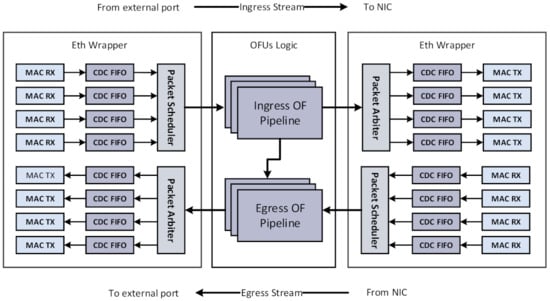 Figure 4 illustrates the hardware design architecture. The FPGA is located between the network port and the NIC ASIC as an inline reconfigurable fabric. The data path within the FPGA is distinguished into two directions: ingress and egress. The ingress stream is from the external port, vectoring to the software switch, while the egress stream targets the external port from the host. Packets from the ingress stream can be pre-processed with the OFU logic defined by the user. Similarly, the user can program a post-processing OFU for the egress packets. In most cases, the ingress packets that have completed offloaded function (OF) processing will converge with the egress packets and will be output to the corresponding port.