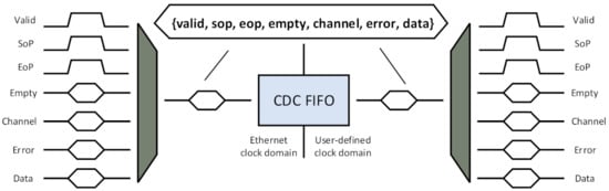 In this design, five synchronous FIFOs are used, and they all work in the same clock domain with a user-defined frequency. The Header Info FIFO and Packet Data FIFO are used to temporarily store data from the ingress when the MATs are unavailable due to the configuration process. The data width of the Header Info FIFO is equal to the packet information data structure, and the data width of the Packet Data FIFO is the sum of each signal width defined in the Avalon interface, as shown in Figure 7. The After MAT FIFO and Egress Input FIFO buffer the data to the egress to avoid packet loss due to the competition of two data flows from different directions to the egress. The data width of these two FIFOs is the same as that of the Packet Data FIFO, and they all have a working mechanism similar to that of the CDC FIFO introduced above.