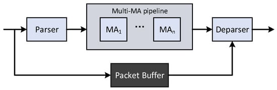The parser is used to extract the packet information, including the MAC address, Ethernet type, IP address, etc. Since the packet processing mainly focuses on header information modification, extracting the header information from the packets to perform the follow-up MA logic while leaving the original packet data in buffer can significantly scale down the logic consumption.
