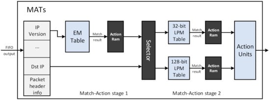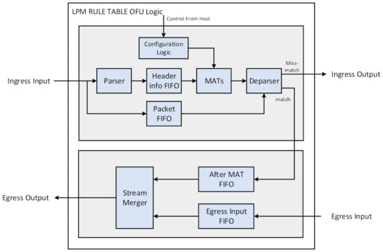 Figure 9 shows the details of the hardware implementation of this OFU logic. The packets from the ingress stream are first parsed by the packet parser to generate a series of packet information whose data structure is introduced later, and then, the packet information and the packet data are fed into the FIFOs to prevent packet loss due to the MAT configuration process. Once the MATs are ready, one piece of packet information is read out and input into the MATs for processing. For the packets that match the rules existing in the rule table, the MATs recognize them and carry out a series of actions that are described in the rules, while mismatched ones simply pass through the module. For some actions, such as forward and drop, that cannot be performed immediately, the MA logic will modify the state field in the packet information for follow-up processing in the deparser module. After that, all packets’ header information and original packets’ data from Packet FIFO are combined in the deparser module. The output interface of the deparser is reverted to the Avalon streaming interface, and a specific signal is modified (if needed) according to the state field in the packet information that was previously modified in the MA logic. After deparsing, the mismatched packets are sent to the host for further processing, while the matched ones are fed into After MAT FIFO. Finally, the stream merger that simply performs a round-robin algorithm merges the packets from ingress and egress into one stream to the output port. A detailed description of each module is given later in this section.