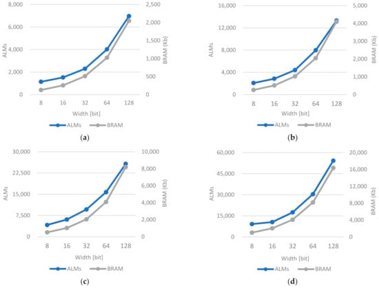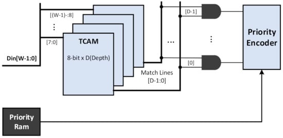 In this design, two kinds of match tables are used in MA logic. The Exact Match (EM) table is used to match the IP version information and direct the packet information to the right LPM table for looking up. Accordingly, a very small-sized Binary Content-Addressable Memory (BCAM) is sufficient to implement the EM table. The register-based method is a better way to implement a small-sized BCAM with high performance and low resource consumption. As for the implementation of the LPM table in the FPGA, Ternary Content-Addressable Memory (TCAM) is used. Hardware-implemented TCAMs are able to search the whole memory space for a specific value within a single clock cycle due to their ability to perform a massively parallel search. There are two main implementation approaches of TCAM, namely registers-based and RAM-based, and the RAM-based solution is more applicable for large-scale implementation []. RAM-based TCAM is always implemented using the transposition method. RAM is addressed by the data of each entry in the TCAM, and each bit of the RAM data indicates the presence of that entry. The position of the data bits corresponds to the address (also called the entry ID) of the TCAM. For example, if the address A of the RAM stores a binary number ‘0010’, it means that the second entry of TCAM with a depth of 4 contains A. Next, we analyze the RAM resource consumption. Suppose there is TCAM with width W and depth D. Then, the RAM size required to implement this TCAM by transposition method is  bits. However, when the width of the TCAM becomes wider, the required RAM size also increases dramatically. To solve this dilemma, the concatenating approach is used. Dividing a wide TCAM into multiple narrower equal-sized TCAMs can efficiently reduce the RAM consumption. If a TCAM with a width of 8 bits and a depth of D is used as a concatenation cell, which consumes a -bit RAM, the RAM size used to implement a  TCAM is reduced to  bits.
