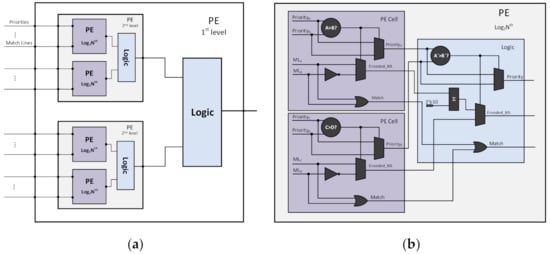The LPM PE was designed with a recursive style to achieve high area efficiency and low latency. As illustrated in Figure 13a, the input MLs are partitioned into two equal-sized parts and then fed into the next-level PE, repeating the partition until the th level. At the th level, the inputs are only two MLs and the corresponding priorities, and the ML with a higher priority is elected and participates in the upper level encoding along with its priority as input. The recursion repeats until the ‘winner’ is crowned in the first level. Figure 13b shows the encoder logic in the th level. By introducing the priority RAM, the PE judges the winner depending on the input priority. Therefore, this PE does not require the TCAM to reprioritize all the entries when including a new entry, which massively reduces the cost of the TCAM.