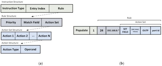 Configuration logic is used to configure the MATs, including initialization, adding rules, deleting rules, and updating rules. The instructions and rules are generated by the software and downloaded to the FPGA using the given API. The instruction structure is shown in Figure 14a. Instruction Type indicates the operation mode, including initialize, populate, delete, and update. The Rule structure consists of Priority, Match Field, and Action Set. The Action Set literally consists of several actions, and each action is composed of the action types and operands listed in Table 1. Figure 14b shows an example of an instruction. Once the instruction is given, the configuration logic will parse it into separate operations, including configuring the match tables that are equivalent to the TCAMs in this design and block RAMs (BRAMs) performed as action RAMs. Initialization will delete all the existing rules by zeroing the LPM table and RAMs. When adding a new rule to the MAT, the match field and its priority are written into the TCAM-based LPM table and the corresponding action set is stored in the action RAM. Deleting a rule clears the data in the TCAM and RAM with the address of the given entry index. If an update operation is needed, the new action set is written into the action RAM using the given entry index as the address.