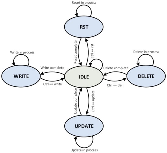 The main components of the configuration logic include an instruction FIFO and a finite state machine (FSM). The instruction FIFO is used to cache the instructions to prevent instruction loss due to a mismatch between the write rate and execution rate of instructions in extreme cases. If the FIFO is full, new instructions fail to be written until a previous instruction is completed. The FSM is illustrated in Figure 15, containing five different states, namely Reset, Idle, Write, Delete, and Update. The Reset state is used to reset the TCAM and action RAM—that is, to assign a value of zero to all addresses. The Idle state is used to wait for a new instruction or for configuration process completion. The Write state is activated when adding a new rule. The match field is written into the TCAM according to the given index and mask, and the priority and action set are stored in the priority RAM and action RAM, respectively. As updating a rule will not change the match field information, the Update state only asserts the write enable of the action RAM to update the action set of the specific rule. Lastly, the Delete state is used to delete an existing rule by clearing the data stored in the TCAM and RAM with the address of a given entry index.