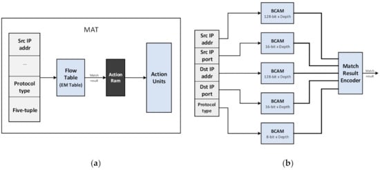 This function can be designed as an OFU in our FSNIC-based accelerator, which has a similar architecture to the LPM rule table OFU illustrated in Figure 9, except for the MAT. The MAT design is shown in Figure 16a. The parser firstly extracts a series of header information, and a five-tuple (source IP address, destination IP address, transport protocol number, source port number, and destination port number) is used in this design. After that, the five-tuple is used to look up a flow table to search for a matching flow entry cached in the flow table. The flow table is designed based on BCAMs, because the flow identification is an EM. Multiple BCAMs are concatenated to build a larger BCAM to support more match fields in a more area-efficient way, and each BCAM is responsible for the lookup of one match field, as shown in Figure 16b. If a packet does not match any entry in the flow table, it is vectored to the software to decide whether a new rule should be generated. If so, the rule is downloaded to the FPGA via configuration logic. The matched packets will be processed according to the action set retrieved from the action RAM with the match result of the flow table as the address.