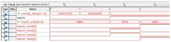 We used the Quartus Signal Tap Logic Analyzer to capture real-time signals in FPGA to verify the LPM table. Figure 20 shows the real-time-captured operating waveform of the LPM table. The lookup_data is the parsed destination IP address of packets, using as a key to lookup the LPM table shown in Table 4. The match_lines indicates the matched entry ID for the lookup_data. The match indicates whether there is a match for the input lookup_data. The match_addr is the encoded value from match_lines by LPM PE. Since the searching latency is constant at two clock cycles due to the delay caused by BRAM access, the match information appears after two cycles since the lookup_data entered. For example, the bit 1 and bit 2 of match_lines are asserted at , which means the lookup_data at  matches the entry 1 and 2. Finally, the LPM PE selects the winner with longer prefix, which is entry 1. It can obviously draw from the waveform that the LPM table performed a search each clock cycle, which could continuously operate under a clock speed of 200 MHz. The search latency was constant at two clock cycles due to the delay caused by BRAM access. Consequently, the throughput of the LPM table was equal to its operating clock frequency, which was 200 million searches (MS) per second. Since the basic cell of the LPM table was a BRAM-based TCAM with a width of 8 bits, the write latency turned out to be  clock cycles. Similarly, the EM table could achieve the same performance as the LPM table because they were all built based on the same CAM architecture. Unlike LPM, the EM table had a shorter write latency of two cycles because the EM table was built with BCAMs.