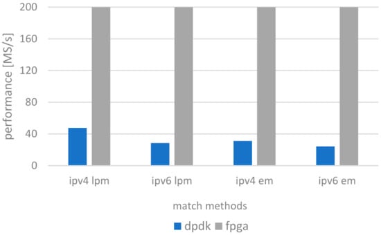 In order to evaluate the performance improvement of matching algorithms gained from the hardware implementation, we compared the performances of hardware and software implementations with the match tables of the same size. The software implementation of LPM and EM was borrowed from the DPDK library, whose matching performance has been approved extensively, and the test was performed using only one logic core in the server introduced in Section 6.1 with the Centos operating system. Figure 21 depicts the performance comparison between the hardware and software implementations of different matching methods. The number of rules was selected as 1K. For LPM, the match field was selected as the IPv4 destination address and the IPv6 destination address, and the match field of EM was always the five-tuple. For software implementation, the matching performance decreased as the match field increased, whereas the performance of hardware implementation was not affected by the size of the rule table, which is area-sensitive.