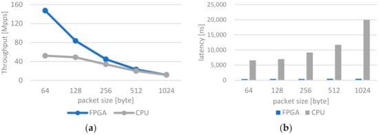 Packet forwarding performance comparison between FPGA and CPU. (a) The respectively achieved highest throughputs; (b) the generated latency of packet forwarding performed by FPGA and CPU.