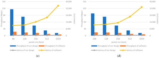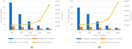 In this section, we evaluate the overall performance of the two OFUs. The software implementation used for comparison was a DPDK application that performs the function of fast path of DPDK accelerated Open Virtual Switch (OVS-DPDK) []. Briefly, the application parses the received packets and looks up the cached-rule table with corresponding match fields, performing the specified actions for the matching ones. The performed actions included setting up MAC addresses, TTL decrement, inserting VLAN headers, IP header checksum (only for IPv4), and output to specific ports. In addition, the N3000 was configured to function as an NIC when carrying out the above test. We evaluated the system performance of software and hardware implementations of different rule tables, respectively, and the measurement was performed under the assumption that every packet for the test hit the cached rules. Ixia generated the test traffic, which was traffic with a CBR of 100 Gbps and fixed packet sizes from 66 to 1024 bytes. Figure 23 compares the throughput and latency of different implementations. The result shows that offloading the rule table onto the FSNIC could significantly improve the performance. The achieved throughput reached 100 Gbps with full-sized packets, which is nearly seven times better than that of software when processing small packets, and the latency reduced over 100-fold.