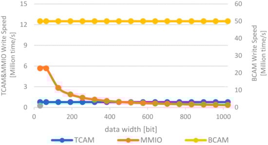 The configuration efficiency of the rule table is also an important factor that affects the overall system performance due to the rapid change of SDN rules in the actual network. The update of the hardware rule table is performed in two main parts. The host gives instructions to the hardware via the API, and then the hardware parses the instructions and executes them. Consequently, the update efficiency of the hardware rule table is related to the rate of writing MMIO registers and the configuration rate of the hardware MAT, and the configuration rate of the hardware MAT is related to the configuration rate of the CAM-based match tables, including the TCAM-based LPM table and the BCAM-based EM table. Figure 24 depicts the writing rate for the three elements related to the update efficiency, with the ordinate showing the number of writes per second and the abscissa indicating the size of data per write. The results in the figure show that the writing speed of the BCAM is not the bottleneck of the update performance of the EM table, so its performance is limited by the writing rate of MMIO registers. The instruction lengths of the three operations for the EM table were 456, 328, and 160 bits, and thus, the configuration performance of the EM table is the corresponding access speed of MMIO registers, which is shown in Table 5. For the LPM table, the writing speed of the TCAM limited the update efficiency when the instruction length did not exceed 512 bits, and the speed of accessing MMIO registers could have been a bottleneck when the instruction length exceeded 512 bits. Table 5 shows the limiting performance of the three operations under stress testing. The populate and delete operations are related to the configuration of the LPM table, and the required instruction length is less than 448 bits, so the ultimate performance of these two operations is limited by the writing efficiency of the TCAM. The update operation is only related to the action RAM, so its performance is only restrained by the writing speed of MMIO registers.