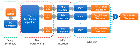 The pipeline for the overall design is shown in Figure 1. The input of the system is a register-transfer level (RTL) netlist of the circuit. The Design Compiler tool from Synopsys® was used to synthesize the circuit into a gate-level netlist, which was then passed into the tier-partitioning algorithm, which provides the individual tier netlists. The details of the tier-partitioning algorithm are discussed in Section 2.2. The individual tier netlists are then passed to the Synopsys® ICC2 tool for the placement and routing (P&R) flow. The power dissipation results of each tier are generated from the P&R design and added together to get the overall result of the 3D IC. Each tier in the design is of the same size and is reduced depending on the number of tiers in the 3D design. For example, if it is a two-tier design, then the total core area of each tier is half the size of the original 2D design.