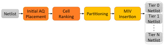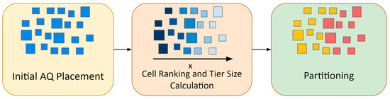 This section describes the details of the AQ partitioner, which divides the netlist into N equal parts. The AQ algorithm works by assigning each standard cell in the gate-level netlist into one specific tier out of the overall N tiers. The principal steps of the AQ partitioning system are outlined in Figure 5. With the help of a placement algorithm, placed cells’ physical locations could be used as a discriminative metric for tier assignment.