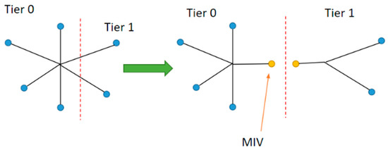 Vertical interconnects such as MIVs are used to carry the signal from one tier to the next. The general representation of an MIV is shown in Figure 7, along with its equivalent circuit model. It consists of two contact resistances and a wire resistance in series with capacitor components with the substrate. Therefore, the MIV could be modelled as a resistor in series with a capacitance in parallel. The size of an MIV is negligible compared to the size of typical standard cells, so there is no density cap placed on the MIV placement. The overall resistance and capacitance of an MIV could be assumed to be 2 Ω and 0.1 fF, respectively, with an approximate diameter of 100 nm [11]. The approximate size and parasitic capacitance of the MIVs are comparable to the antennae diode standard cell, which is already present in the technology library. Therefore, the antennae diode standard cell is used to simulate MIV cells. These cells are placed at the end of each of the nets, which are cut off by the tier-partitioning algorithm, as shown in Figure 8. This insertion is also iteratively performed if the nets spread in more than two tiers, connecting the lowest tier to the highest tier that the net occupies.