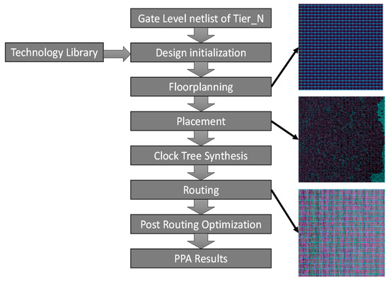 The MIV insertion step is followed by the placement and routing implementation carried out with the ICC2 EDA tool. The detailed steps of this process are shown in Figure 9. The first step of the flow is the design initialization, which sets up the design environment and loads the technology library into the system. A 32 nm standard cell library was used to implement the flow, which was obtained from Synopsys®. The cell density of the different tiers of the 3D design are matched with that of the 2D design to aid in consistency and to achieve a fair result comparison. The design initialization is followed by the floor planning, which builds the PG grid and the core area. Each tier of the design consists of a total of nine metal layers to accommodate the interconnects.