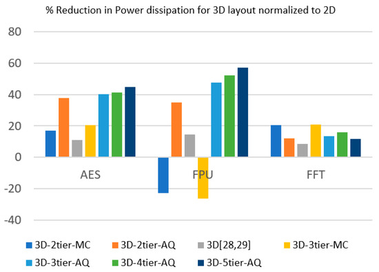 Table 2 shows the power dissipation results and the percentage decrease in total power normalized to the 2D design for different 3D layouts and tier partitioning algorithms. The results are visualized in Figure 10 and show that the AQ algorithm’s overall performance was better than that of the min-cut partitioning. The 3D results compared to the 2D counterparts were first analyzed. They show that the 3D implementation with the min-cut partitioning algorithm produced lower power dissipation for the AES and the FFT circuits while showing an increase in power dissipation for the FPU circuit. On the other hand, the results obtained with the AQ algorithm show a significant reduction in power for all the three benchmark circuits, with the AES circuit showing the most reduction in power dissipation for the two-tier models, while the FPU circuit showed the most power reduction for the higher-tier models. We also compared our results with those from other similar works [28,29], as shown in Figure 10. The FFT 3D comparison results were obtained from [28], where the 3TM metal layer structure was chosen as it produces the best results with no reduction in the metal dimensions, while the AES and the FPU comparison results were drawn from [29], using the T-MI 3D design with the 45 nm node. Only two-tier 3D models were available in these studies. Our two-tier 3D layout developed using the min-cut partitioner produced better results than the related works [28,29] for the AES and FFT circuits, while our model comprising the AQ partitioner did significantly better in all three benchmark circuits. The most likely cause for the better power results of our implementation compared to [28,29] was better partitioning algorithms. However, the exact technology libraries and layout configurations of [28,29] differ from our implementation. As a result, the comparison between the different methods applied in this work alone are more valid compared to those between our implementation and other related studies [28,29].