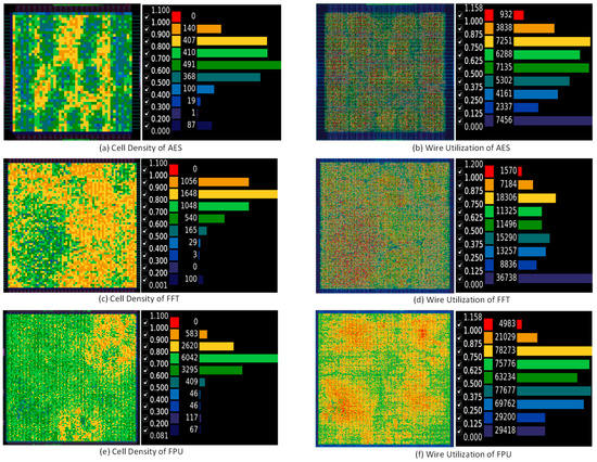 Cell density and wire utilization plots for the different benchmark circuits.