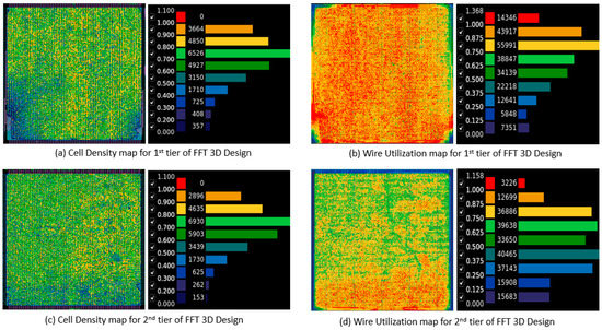 Cell density and wire utilization plots for two-tier FFT 3D designs using the AQ partitioner.