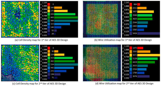 Cell density and wire utilization plots for two-tier AES 3D designs using the AQ partitioner.