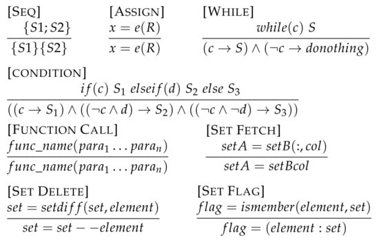 is a combined statement rule, which converts multiple sequentially executed statements into a continuous sequence of logical statements. The statement will be directly converted into an expression with the equal sign (=) as the logical connector. The conditional statement uses the ∧ logical connector to connect the implicit expressions of multiple conditions and results into one expression. Loop statements also use ∧ logical connector, and only need to connect two implicit expressions into one expression. Function call statements are directly converted into logical statements of the same form. The set element-fetching statement is converted into an assignment logic statement with the equal sign (=) as the connector. The set insert element statement uses the –connector, which means that the element is deleted from the set, and then connected with the equal sign (=) as the assignment logic statement. The element belongs to the set statement using the belong (:) connector to indicate that the element belongs to the set, and then connect with the equal sign (=) as the assignment logic statement.