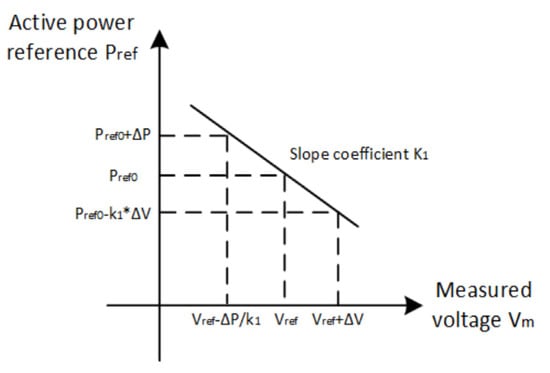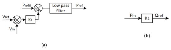 In each inverter, the control algorithm for power regulation is specified in Figure 1. In the voltage against active power in the constant frequency method, active power is managed by voltage variation only, when the frequency is kept at 50 Hz. The active power reference is generated by adding voltage change into the nominal reference active power with a coefficient . Figure 2 indicates that the reference reactive power in a grid-supporting generator is a directly certain percentage of the measured active power. Reactive power in grid-supporting generators tracks the given percentage, while the rest of the reactive power is produced by grid forming generators. The grid forming generator senses the total demand and the portion that is already provided. The two generators co-operate to meet all the reactive power requirements of the load. The microgrid system consists of two parts; the DC side nominal voltage is 800 V, while the load side AC nominal voltage is 415 V. Thus, voltage and current do not deviate too much near these power levels.