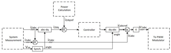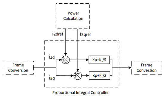 At an early stage, effective and flexible controllers are preferred. Now, we adopt a proportional integral (PI) controller in the synchronous rotating reference frame shown in Figure 4. Figure 4 is a detailed enlarged version of the controller module in Figure 3. The ‘frame conversion’ blocks on the left and right side of Figure 4 are the same a-b-c frame and d-q frame interconversions from Figure 3. This controller has less computation and can be tuned easily.