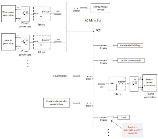Microgrid is an advanced method for integrating distributed energy sources (DERs), converters, energy storage, and loads [1,2]. Distributed energy is widely used to generate electricity from wind, solar photovoltaic, hydroelectric, or biomass energy, taking into account the impact on the environment. However, owing to the uncertainty of the production capacity of these renewable energy sources, how to effectively control and reasonably distribute the power of the microgrid has become a major problem [3].
